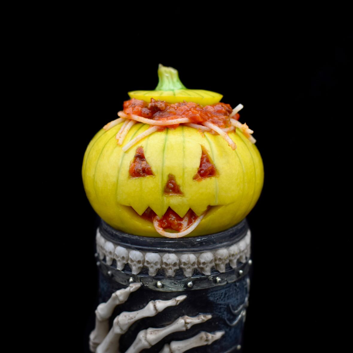 Zucchiolo® relleno de costillar de res brava al tomillo-limón sobre parmentier violeta